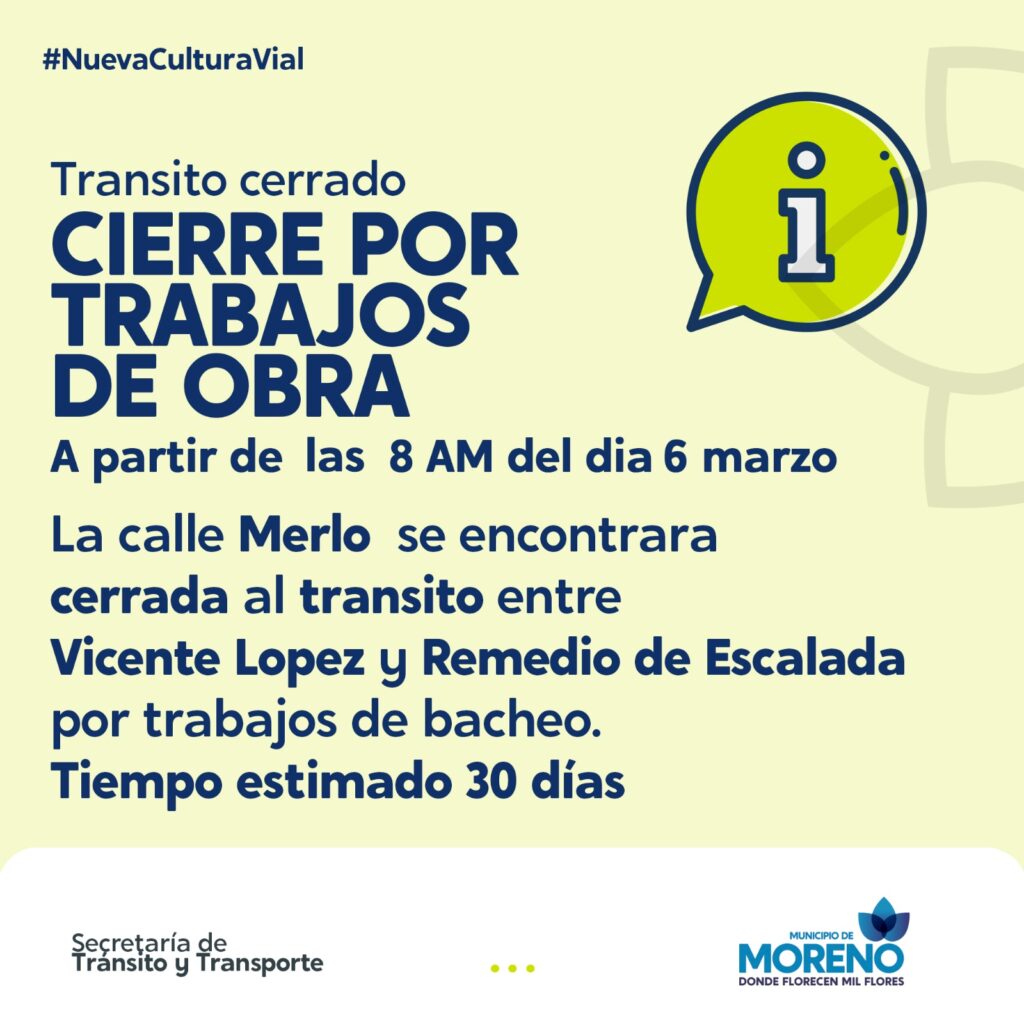 El pasado 6 de marzo desde las 8:00 hs, la calle Merlo se encuentra cerrada al tránsito entre Vicente Lopez y Remedio de Escalada por obras de bacheo. Se estima que el tiempo de cierre será de 30 días.