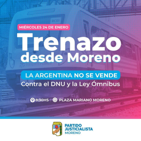 La épica morenense será en tren. La intendenta Fernández difundió un flyer que se propagó rápidamente: “La Argentina no se vende. Contra el DNU y la Ley Ómnibus” resume la convocatoria a un “Trenazo desde Moreno” con cita el 24 de enero, a las 8:30 hs, en la Plaza Mariano Moreno.