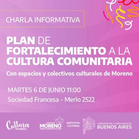 El Municipio de Moreno, a través de la Secretaría de Cultura, Educación y Deportes, realizará una charla informativa sobre el nuevo Plan de Fortalecimiento a la Cultura Comunitaria que lanzó el Instituto Cultural de la Provincia de Buenos Aires. La jornada se realizará el día martes 6 de junio, a las 11 horas, en la Sociedad Francesa.