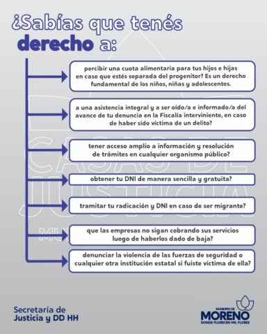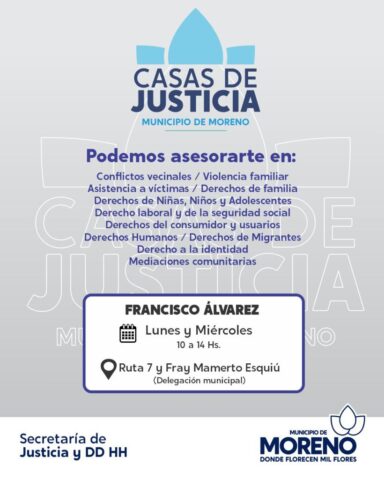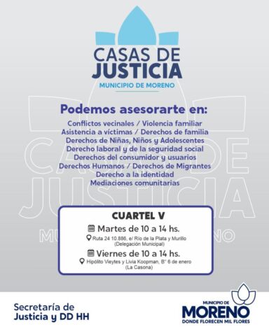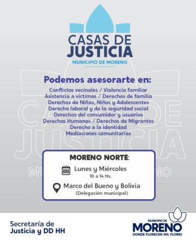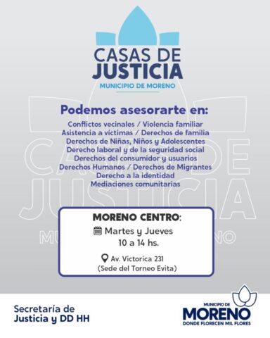 El Municipio de Moreno, a través de la Secretaría de Justicia y DDHH, implementa políticas de acompañamiento y asistencia jurídica integral que funcionan mediante las Casas de Justicia. Las mismas funcionan de lunes a viernes, en las distintas localidades de la ciudad.