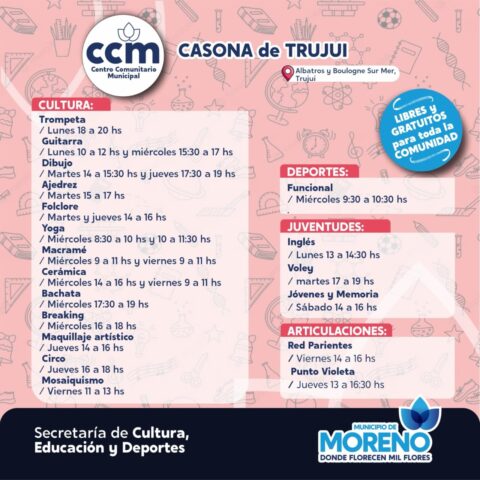 Luego de la renovación y refacción del espacio del Centro Comunitario Municipal (CCM) La Casona de Trujui, el Municipio de Moreno brinda una gran oferta de talleres y actividades libres y gratuitas para toda la comunidad.
