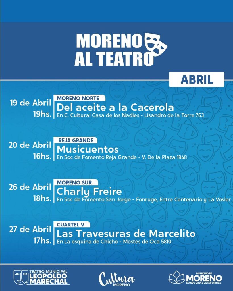 A través de la Secretaría de Educación, Cultura y Deportes local, en la ciudad se presentarán una serie de obras teatrales durante el mes de abril en distintos espacios culturales del distrito, de manera libre y gratuita. En la nota te acercamos los días, horarios y lugares en los que se desarrollarán las obras.