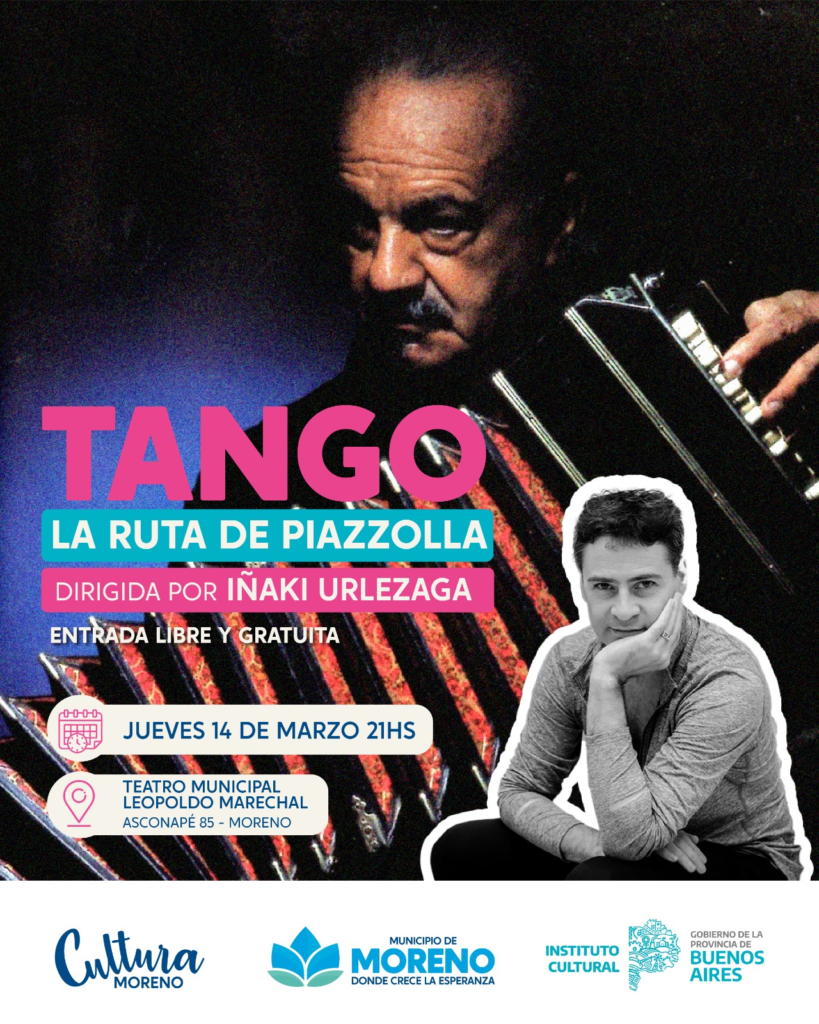La Municipalidad de Moreno, a través de la Secretaría de Educación, Cultura y Deportes y el Instituto Cultural de la provincia de Buenos Aires, presenta el show “Tango – La Ruta de Piazzolla”, bajo la dirección artística de Iñaki Urlezag, este jueves 14 de marzo, a las 21 horas, en el Teatro Municipal “Leopoldo Marechal”, con entrada libre y gratuita.
