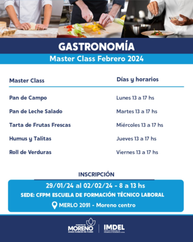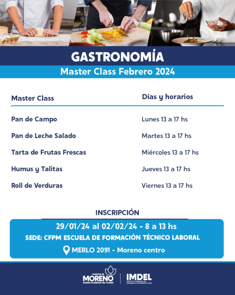 El Municipio de Moreno, a través del Instituto Municipal de Desarrollo Económico Local (IMDEL), brindará una Masterclass sobre Gastronomía 2024, durante el mes de febrero en la Escuela de Formación Técnico Laboral. La inscripción al mismo se debe realizar de manera presencial en la Escuela de Formación Técnico Laboral, ubicada en Merlo 2091, desde el lunes 29 de Enero hasta el viernes 2 de Febrero, de 8 a 13 horas.
