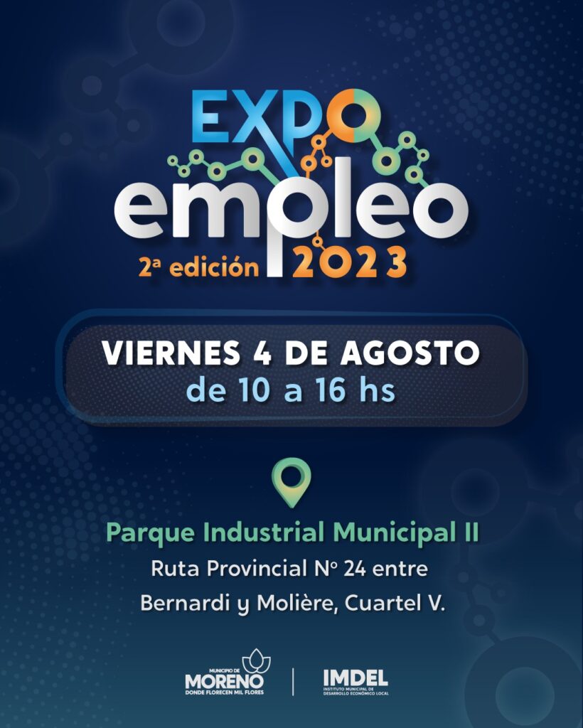El Municipio de Moreno, a través del Instituto de Desarrollo Económico Local (IMDEL), realiza la segunda Expo Empleo del año, el próximo 4 de agosto, de 10 a 16 hs, en el Parque Industrial Municipal II (Ruta 24, entre Bernardi y Molière). Esta iniciativa tiene el objetivo de establecer contacto directo entre personas en búsqueda de empleo y empresas, comercios e industrias locales. El municipio cuenta con 12 Parques Industriales, y más de 250 nuevas industrias: “el crecimiento industrial impacta directamente en Moreno porque en la medida que se fueron radicando empresas, hubo nuevos pedidos y nuevos roles que necesitan cubrir esas empresas”, explica el coordinador general de Empleo y Capacitación para el Trabajo, Juan Lagos.