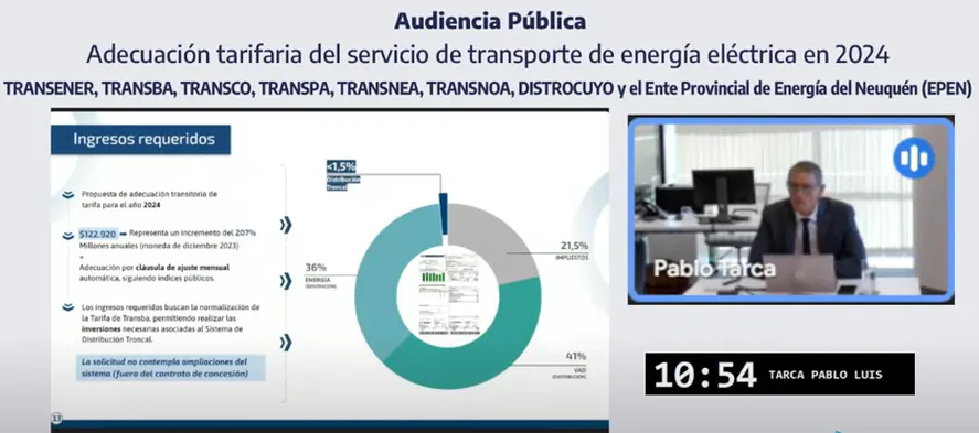 En la audiencia pública de fines de enero, el director de la empresa que brinda este servicio en la provincia de Buenos Aires (TRANSBA), Pablo Tarca, propuso un aumento del 207 por ciento y una cláusula de ajuste mensual. Al exponer, el ejecutivo sostuvo que el servicio de transporte de energía eléctrica representa a solo el 1,5 por ciento del precio final de las tarifas por lo que el usuario no se vería afectado.