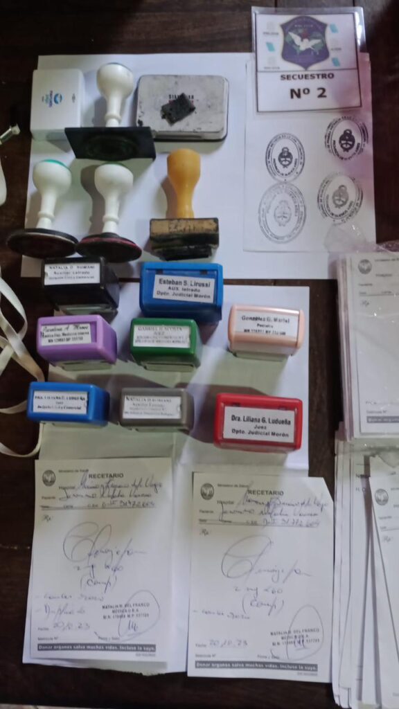 Durante el proceso se detuvo a una mujer mayor de edad y se incautaron: 100 gramos de marihuana; 164 gramos de cocaína; 161 envoltorios; 42.400 mil pesos: elementos de corte para comerciar; celulares; recetarios; sellos de magistrados judiciales, de facultativos médicos, juzgados civiles y comerciales.