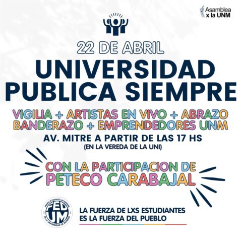 En el marco de la marcha nacional universitaria organizada para este martes 23 de abril, y en rechazo al feroz recorte presupuestario que desde el gobierno nacional están llevando a cabo contra las universidades públicas de todo el país, los estudiantes de la Universidad de Moreno agrupados en el Frente Estudiantil en Defensa de la Universidad de Moreno (FEDUM), el frente que reúne organizaciones estudiantiles como la Comunidad Universitaria Moreno (CUM), La Caveri, La Cámpora, Somos UNM y estudiantes independientes, realizarán distintas actividades abiertas a la comunidad en la puerta de la universidad. El lema convocante “Universidad Pública Siempre”.